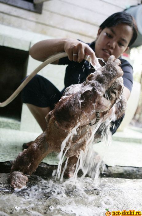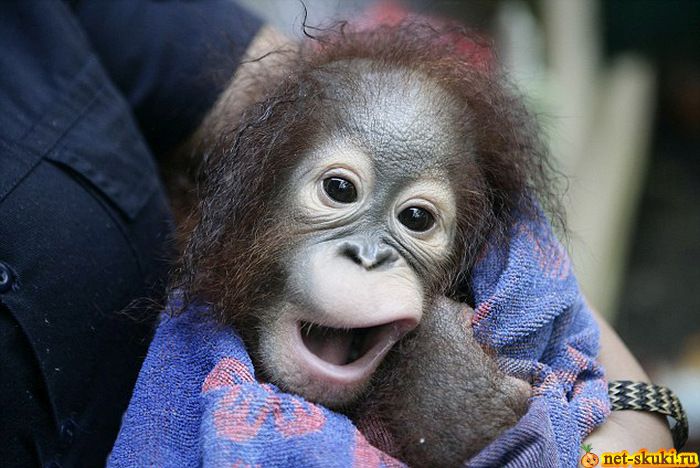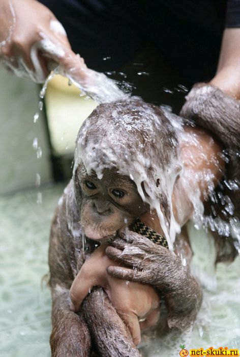 Немало детей поначалу боится купаться или принимать душ, не исключением является и этот маленький орангутанг, который живет на острове Калимантан. На этих фото видно, как малыш схватился за руку человека, а его взгляд говорит о том, чтобы все это поскорее закончилось. Однако, в конце концов, орангутанг остается чистым и довольным. ![]() ![]() ![]()