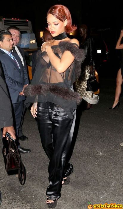 Американская певица Рианна явилась на вечеринку в совершенно прозрачной блузке, которая позволяла без труда разглядеть грудь 27-летней девушки. Украшенная черным мехом блузка была надета вместе с черными брюками и босоножками на платформе.