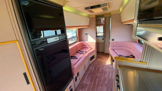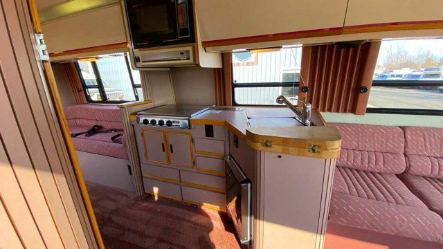 | Дома на колесах, кемперы — очень популярные машины в США. А в конце 1980-х годов появилась компания ElDorado Motorhomes, расположившаяся в Миннеаполисе, штат Миннесота. Проработала она всего 3 года — с 1986 по 1989. Однако этого времени компании хватило, чтобы явить миру свои необычные кемперы, отличающиеся по-настоящему интересным и необычным дизайном. Одна из моделей, произведенных ElDorado Motorhomes, называлась Eldorado Starfire. В общем, как выглядит этот необычный кемпер — смотрите в продолжении поста. К слову, к сегодняшнему дню автомобиль прошел порядка 35 000 километров. А после и вовсе был дополнительно отреставрирован, поэтому и остался в идеальном состоянии. Есть и одна особенность у подобных машин — это пластиковый кузов, который не подвержен коррозии. Длина данного кузова составляет 9,45 м. И на этих почти 10 метрах расположено все, что нужно для комфортной жизни на колесах. Рассчитанный на проживания четверых человек, кемпер имеет внутри огромное количество мест для хранения всего, что вы взяли с собой в поездку. Разумеется, здесь есть четыре полноценных спальных места. Кроме того, есть дополнительные диваны в задней части. Кстати, если все спальные места сложены, то сидеть в машине могут до 13 человек. Есть и обеденная зона. А кухня оборудована всем, что понадобится для приготовления еды — газовой плитой, духовым шкафом, микроволновой печью, мойкой, вытяжкой, холодильником, блендером и даже генератором льда. Если же посмотреть на фотографии, то в салоне можно найти еще и телевизор со стареньким магнитофоном. ![]() ![]() ![]() ![]() ![]() ![]() ![]() ![]() ![]() ![]() ![]() ![]() ![]() ![]()