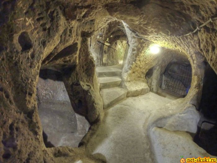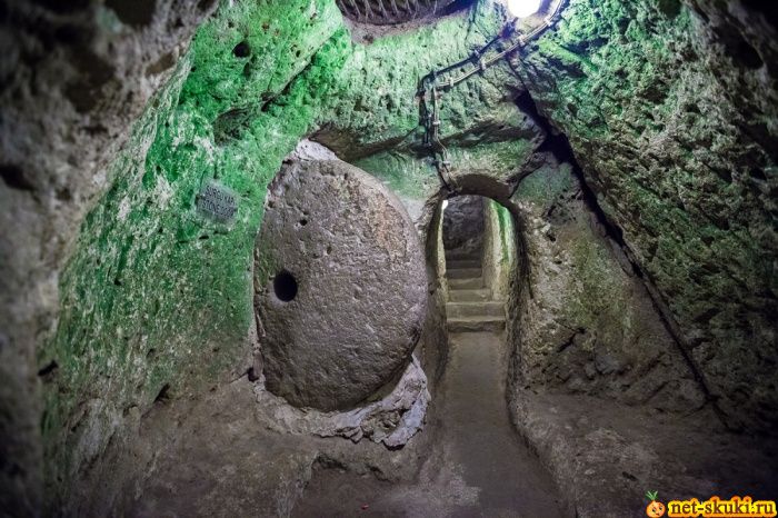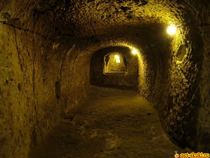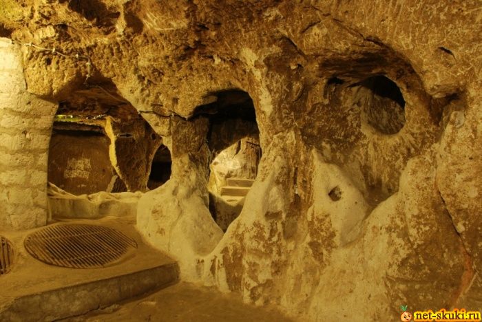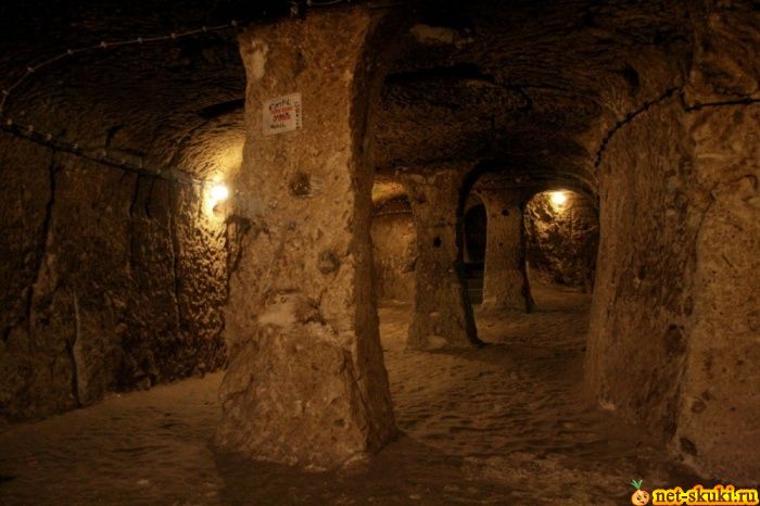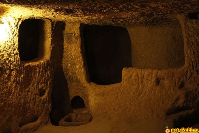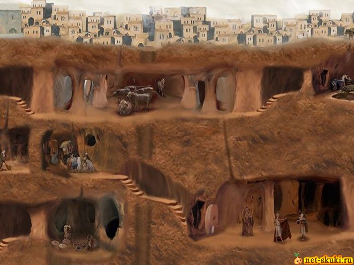 | Под турецкой деревней Деринкую был обнаружен древний город, возраст которого порядка 3000 лет. На этом месте археологи работают уже более 50 лет, но до сих пор не могут понять, кем было построено селение. История обнаружения и другие интересные факты о подземном городе ждут вас далее. Город уходит на глубину в 80 метров и в нем могло проживать около 20 тысяч жителей Здесь есть все, что необходимо для жизни: шахты для вентиляции, стойла для скота, амбары и погреба для хранения продуктов, храмы, жилые кварталы со школами и магазинами, кухни с печами и столовые, а также кладбище. Нашлись и винодельни с винным прессом. По мнению археологов, город уходит еще глубже под землю. Для посещения туристов открыта лишь небольшая часть города. Лабиринты здесь помечены так, чтобы никто в них не заблудился. Входы в лабиринты города прикрывали большие каменные двери, выполненные в форме колес. Внутри есть множество потайных ходов, позволяющих выбраться на поверхность и соединяющих друг с другом коридоры лабиринтов. Ранние христиане могли быть последними жителями города. Примечательно, что жили здесь представители разных культур. Одни оставляли город, другие приходили им на смену. Заброшенным поселение оказалось в VIII веке нашей эры. А обнаружились пещеры в 1963 году, когда один житель деревни задумал сделать ремонт в доме и снес стену, за которой он увидел другую комнату и вход в лабиринт.