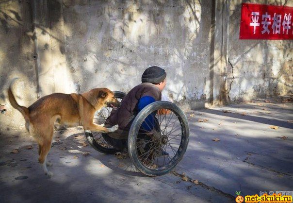 Преданная собака каждый день помогает своему хозяину с ограниченными физическими возможностями подняться в гору по дороге на окружную ярмарку.