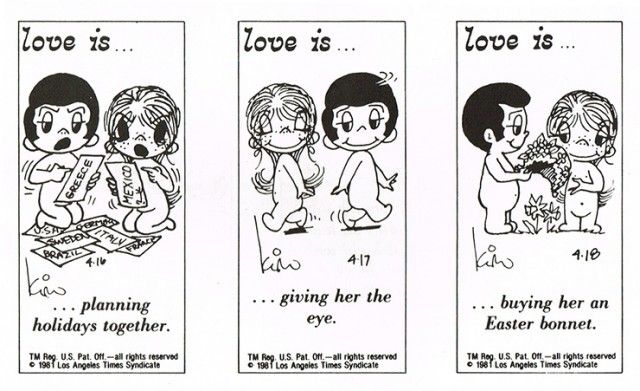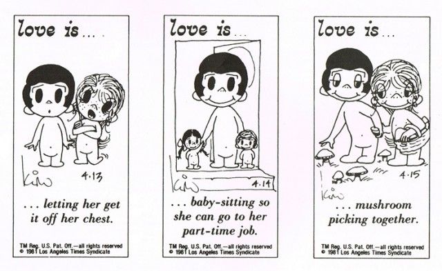Комиксы Love Is… созданы новозеландской художницей-мультипликатором Ким Касали и обрели широкую популярность по всему миру. Но мало кто знает что содержание красочных этикеток и было содержанием жизни юной девушки. Все трогательные слова и картинки были посвящены мужу Ким. Комиксы Love Is… созданы новозеландской художницей-мультипликатором Ким Касали. Когда Ким было 19 лет, она отправилась путешествовать по миру, а спустя шесть лет поселилась в Калифорнии, где познакомилась с итальянцем Роберто Касали. Она рисовала ему на салфетках короткие сценки с участием пузатой обнаженной девочки и такого же мальчика. «Я делала маленькие зарисовки, чтобы выразить, что я чувствую… Это было все равно что вести дневник моих эмоций, где описано, как развивались мои чувства. Сначала я нарисовала капельку, которая стала девочкой, это должна была быть я. Она испытывала все эти фантастические чувства. Потом я нарисовала другую капельку — мальчика, который был причиной этих чувств». Ким и Роберто поженились в той же церкви в Новой Зеландии, в которой женились родители Ким. На девушке были корона из маргариток и вуаль — такую же потом она нарисовала своей пузатой героине. Она вспоминала: «Мой отец умер, когда я была молодой, так что когда Роберто попросил меня выйти за него замуж, я согласилась, но сказала: „Что бы ты ни делал, не умри на мне“. Он засмеялся и пообещал, что попытается». Роберто решил продюсировать выход комиксов, и так «Love is» увидели свет 5 января 1970 года. В комиксе 1974 года мальчик называет девочку Ким, а раньше, в комиксе 1971 года, девочка чертит на песке букву R — первую букву имени Роберто. Ким никогда не считала себя настоящей художницей. В одном из интервью 1981 года Ким говорила: «Если бы у меня был выбор, то я стала бы автором романтичных песен. Песни о любви глубоко меня трогают… Но я не умею красиво писать, поэтому мне пришлось выбрать другой способ выразить свои чувства». Комиксы быстро набирали популярность: их теперь печатали не только в журнале. Они появлялись на футболках, календарях, плакатах, кружках и многом другом. Персонажи саги «Love is…» проходят разные стадии отношений — от знакомства до супружеской пары и смерти одного из героев. У героев комиксов, как и у настоящих Роберто и Ким, были дети. Правда, нарисованные дети были мальчик и девочка, а в жизни в 1971 году Ким родила сыновей Стефано и Дарио, когда семья перебралась в Англию. Популярность картинок «Love is…» продолжала расти, и Роберто стал управляющим делами Ким. Для этого была создана корпорацию Minikim. Животные в комиксах тоже есть! Иногда на рисунках появляется собака по имени Самсон, а в другой раз мы видим могилку с именем Фидо на ней — судя по всему, это почивший пес пары. В комиксах 2005 года у пары есть два кота, а в 2009 году девочка плачет над погибшим котиком. К сожалению, счастье длилось недолго. В 1975 году Роберто диагностировали неизлечимую стадию рака яичек, очень агрессивного. Ким перестала работать над комиксами, чтобы проводить больше времени с любимым. Но совсем бросать комиксы Ким не планировала: она попросила английского аниматора Билла Эспри рисовать комиксы за нее, подписывая ее никнеймом. Именно из-под кисти Билла стали выходить первые цветные комиксы с одетыми персонажами «Love is…», которые переняли художники России, Турции и Украины. «Следующий год я провела в по