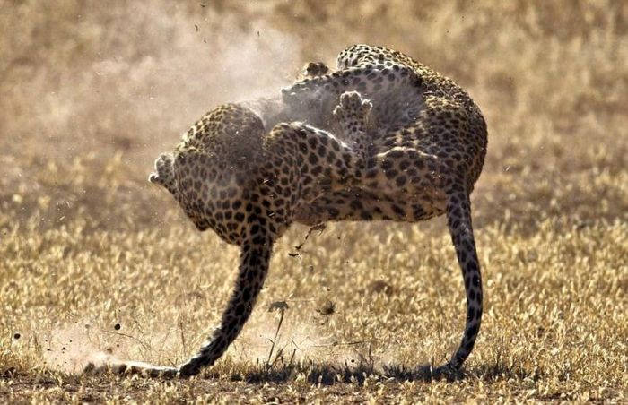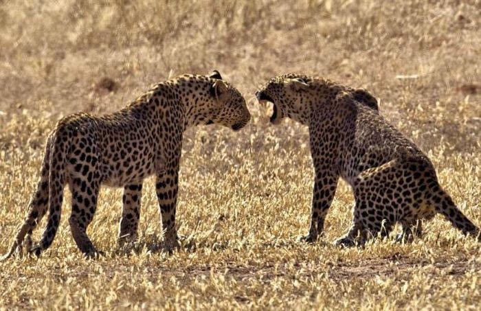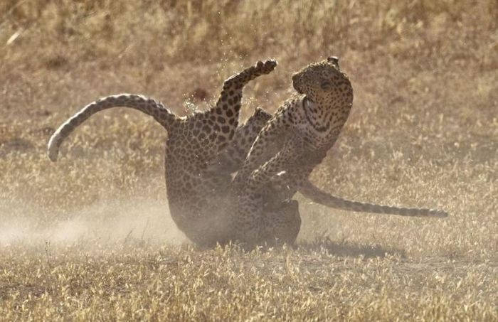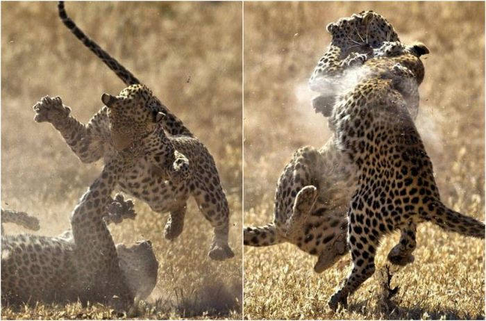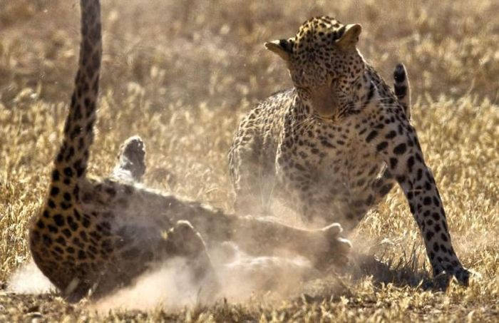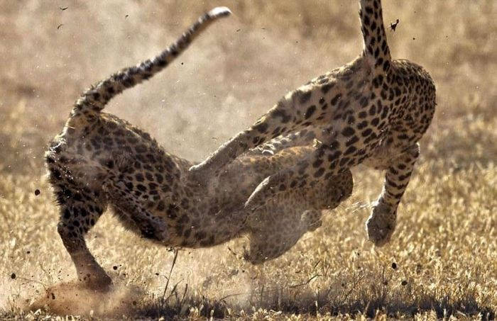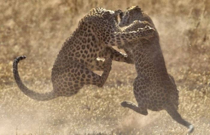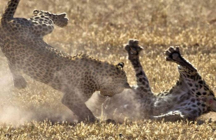 Яростную схватку двух самок леопарда снял 52-летний фотограф Fanie Heymans в Трансграничном парке Кгалагади в Южной Африке. Дикие кошки набросились друг на друга в борьбе за территорию. Стремительный бой продлился не более 15 секунд и самки разошлись в разные стороны.