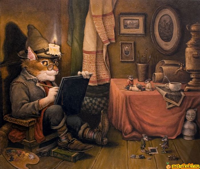 Работы художника Александра Маскаева – это волшебный мир сказочных персонажей и добрых котеек. Рассматривая котоистории, невольно погружаешься в мурлычущую, пушистую и бесконечно добрую атмосферу. Стоит заметить, что каждая работа мастера помимо явного смысла несёт скрытый подтекст, поначалу не сразу заметный.