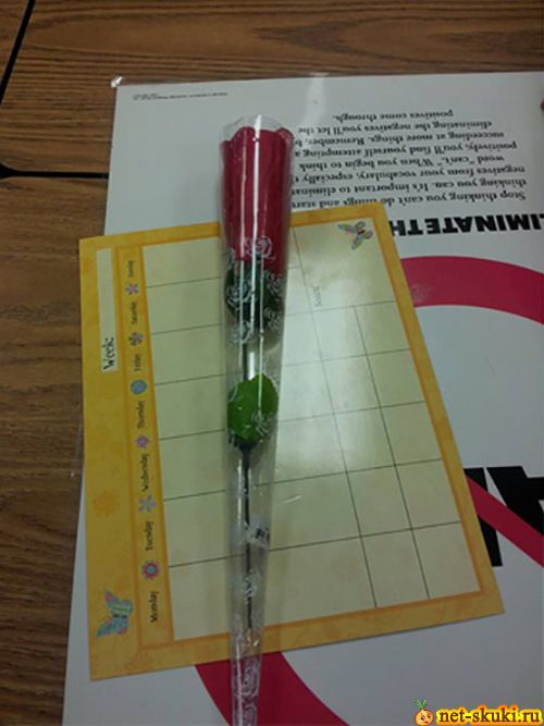 Подобную розу ученик подарил своей школьной учительнице, однако, та, ничего не заподозрив, принесла букетик домой. Неладное заметил муж женщины, который очень удивился тому из чего был сделан цветок. Сам ученик говорит, что купил розочку в магазине цветов, но верится в это с большим трудом.