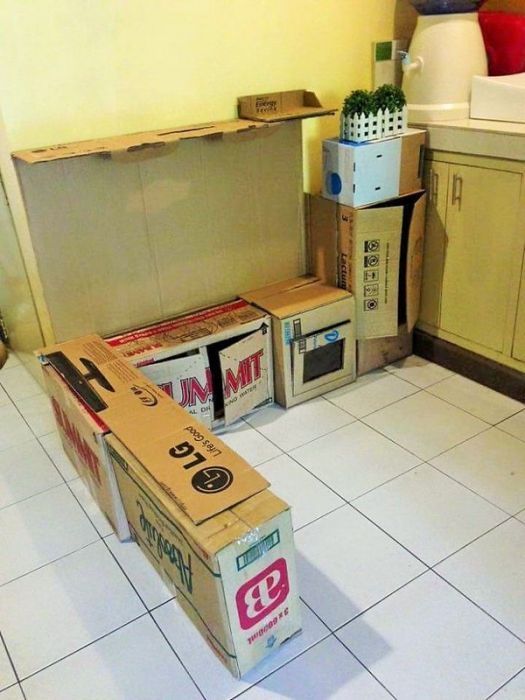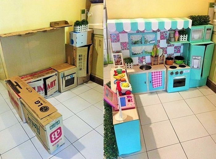 | У одной филиппинской девочки была своя маленькая кухня из картонных коробок, где она очень любила играть и проводила большую часть своего времени. Мама девочки решила немного улучшить игрушечную кухню, и вот, что из этого вышло. Даже маленькая девочка проводит большую часть времени на своей детской игрушечной кухне