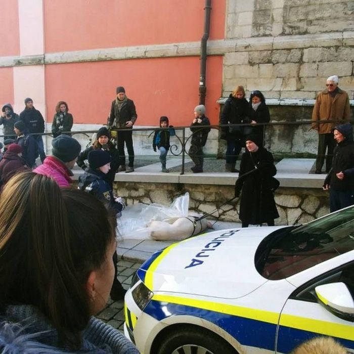 В центре Любляны, Словения, прохожие стали свидетелями неприятной сцены: 25-летняя барышня волокла по улице дохлую свинью в знак протеста против потребления мяса. Словенское веганское общество поспешило откреститься от неадекватной гражданки, заявив, что это не их методы.