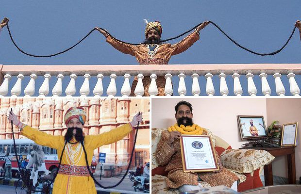 62-летний Рам Сингх Чаухан из индийского города Джайпур с гордостью удерживает титул обладателя самых длинных усов на планете. Он начал отращивать усы с 1970 года, и теперь их длина составляет 5,6 метра. На уход за своим сокровищем, занесенным в Книгу рекордов Гиннесса, Рам ежедневно тратит 2 часа.