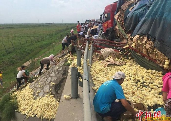 В китайской провинции Шаньдун грузовик перевернулся. А перевозил он 10.000 цыплят, которые разбежались по дороге. Полиция перекрыла трассу, чтоб фастфуд не раздавили. Обратно загрузили далеко не всех цып. Многих местные себе подобрали.