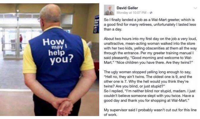 "Наконец-то я устроился на работу в качестве швейцара в магазине "Wal-Mart", что совсем не плохо для пенсионера, но, к сожалению, продержался я там менее суток."