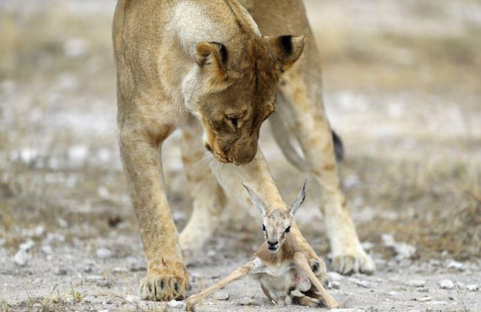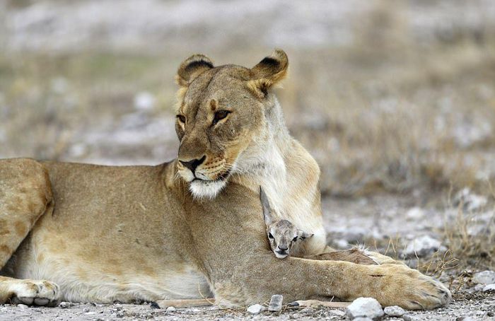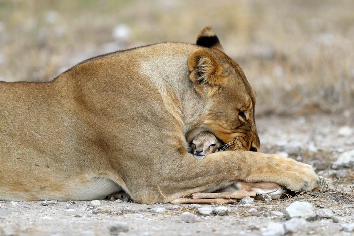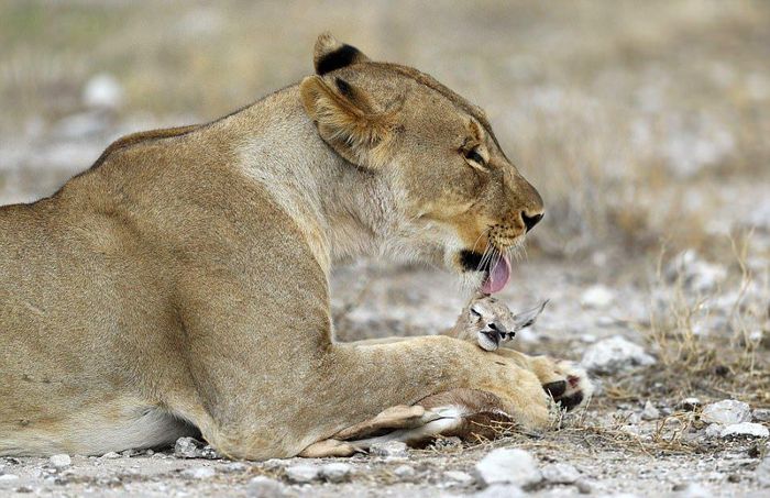 Глядя на эти кадры, можно подумать, что львица играет с едой, но это не так. Большая хищная кошка заботиться о маленькой антилопе спрингбок, как о собственном потомстве. Хоть антилопа и является естественной добычей, эта скорбящая львица приняла теленка после того, как ее собственных детенышей убил лев из конкурирующего прайда. Львица нежно ухаживает за антилопой и оберегает ее от опасностей. Она даже защитила теленка от пары беременных львиц, которые бродили в поисках пищи. Эти умилительные кадры сделал фотограф из Нью-Йорка Гордон Донован (Gordon Donovan) в Национальном парке Этоша в Намибии.