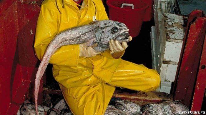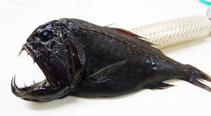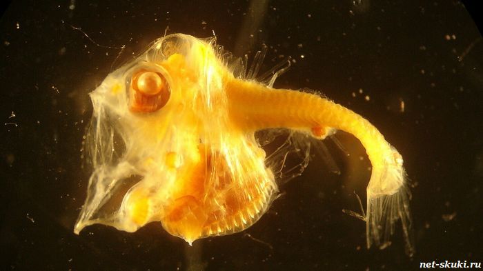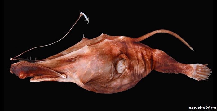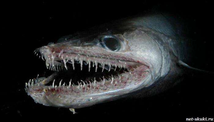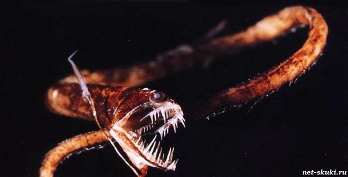 10 самых страшных чудовищ из океанских глубин. 1. Мешкорот. Мешкорот — единственный известный род глубоководных рыб семейства Мешкоротых. Они достигают 2 метров в длину и обитают на глубине от 2 до 5 километров. Их особенностью является большой, сильный и гибкий рот с загнутыми внутрь пасти зубами. В черепе этих рыб отсутствуют некоторые кости, поэтому мешкороты легко распахивают пасть почти на 180 градусов. На большой глубине не всегда достаточно пищи, поэтому рыба приспособилась наедаться впрок, заглатывая пищи больше собственного веса и размера. Наевшийся «под завязку» мешкорот можно длительное время обходиться без еды. 2. Гигантский макрурус. Гигантский макрурус наиболее часто встречается в морях, омывающих Россию: в Охотском — у побережья Камчатки и в Бериговом — вблизи Курильских и Командорских островов. Здесь она известна как «малоглазый долгохвост» или «малоглазый макрурус», хотя в других странах общепринято называть ее гигантским гренадером. Размеры рыбы — по сравнению с другими глубоководными существами — действительно огромные. Взрослые особи могут достигать 2-х метров, а их масса равняться 20–30 кг. Максимальный зарегистрированный возраст взрослой рыбы составил 56 лет, но считается, что гигантский макрурус может прожить ещё дольше. Молодые рыбы обычно держатся недалеко от поверхности, на глубинах от 200 до 500 метров. По мере взросления гигантский макрурус уходит всё глубже, опускаясь на 3 500 метров и глубже. 3. Умелый рыболов. Lasiognathus — род глубоководных лучепёрых рыб семейства тауматихтовых — обитает в Тихом и Атлантическом океанах. Среди ихтиологов известна под неофициальным названием «умелый рыболов». Своё прозвище Lasiognathus получил неспроста. У этой глубоководной рыбы имеется почти настоящая удочка, с помощью которой она охотится на других рыб и беспозвоночных. Это приспособление состоит из короткой удочки (базальной кости), лески (видоизмененного луча спинного плавника), крючка (больших кожных зубчиков) и приманки (светящихся фотофор). Эта снасть действительно примечательная. У разных подвидов Lasoignatus строение удочки может варьироваться от короткой (до середины тела), до длинной (гораздо больше тела). Обитают эти рыбы на больших глубинах — около 4 километров. 4. Саблезуб. Саблезуб — глубоководная рыба, обитающая в тропических и умеренных зонах на глубине от 200 до 5 000 м. Вырастает до 15 сантиметров в длину и весит всего 120 грамм. Самое примечательное же у нее — два длинных клыка, которые располагаются на нижней челюсти. По соотношению с телом они самые длинные среди рыб, известных науке. А чтобы Саблезуб мог закрывать пасть, природа наделила его специальными пазами в верхней челюсти и разделила мозг рыбы на две части. 5. Рыбы топорики. Рыбы-топорики — глубоководные рыбы, встречающиеся в умеренных и тропических водах мирового океана. Свое название они получили за характерный внешний вид — узкий хвост и широкое «тело-топорище». Наиболее часто их можно встретить на глубинах от 200 до 600 метров. Однако известно, что они могут жить и на глубине 2 километра. Их тело покрыто серебристой чешуёй, которая легко отскакивает и сильно сжато с боков. Размеры «топориков» небольшие, а у некоторых особей длина тела составляет всего лишь 5 сантиметров. 6. Идиакант — небольшие, довольно редко встречающиеся глубоководные рыбы семейства Идиа