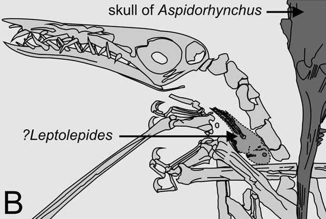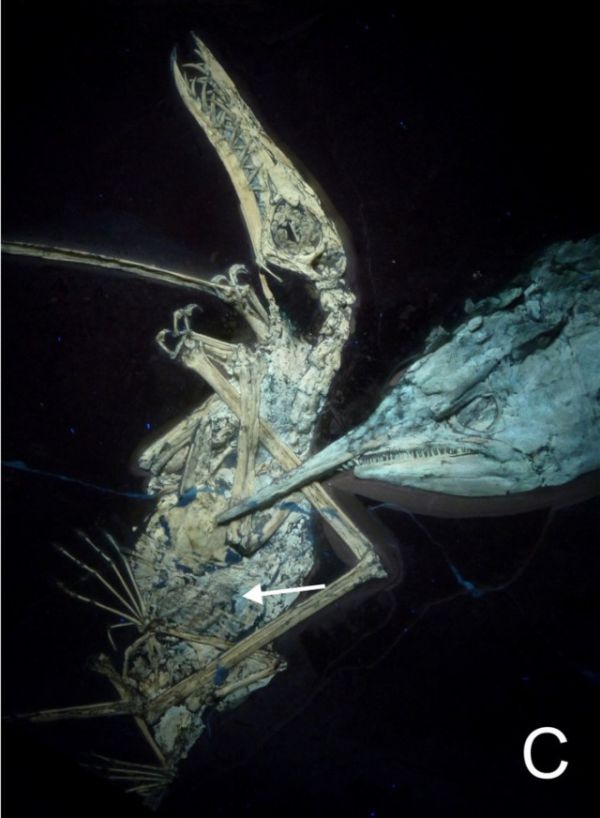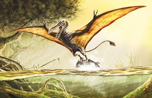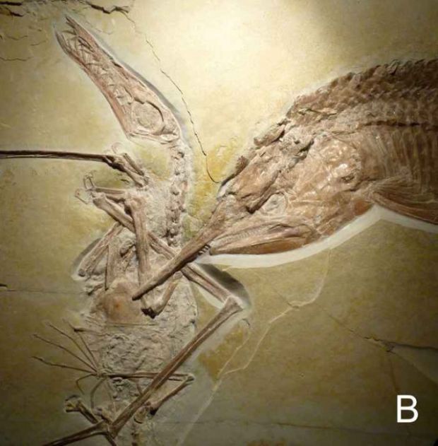 На дне морей и океанов можно найти немало удивительных находок, которые рассказывают о событиях, происходивших на нашей планете задолго до нашего появления. К одной из таких находок, которой примерно 155 миллионов лет, относятся эти окаменелые скелеты. Изучив скелеты, палеонтологи определили, что один из них принадлежит птерозавру рамфоринху, а другой крупной лучеперой рыбе Aspidorhynchus. Ученым удалось воссоздать картину смерти животных. Рамфоринх охотился на рыб, но в какой-то момент сам был атакован рыбой. Проткнув тонкую мембрану крыла, рыба застряла зубами в теле пресмыкающегося. Освободиться она так и не смогла, а потому опускалась все глубже и глубже, пока не оказалась на критической для нее глубине, где и погибла. Вместе с ней погиб и рамфоринх, который даже не успел проглотить свою последнюю добычу. А вот так примерно выглядел рамфоринх во время охоты.