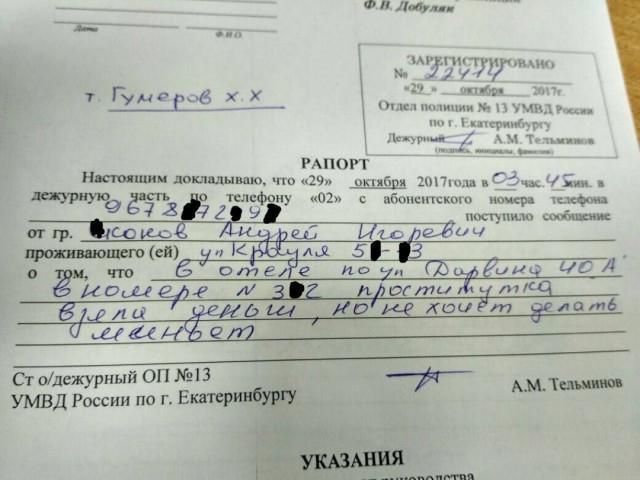 Недовольный качеством оказания услуг проститутки мужчина написал сразу два заявления в полицию. Одно из заявлений он написал в Екатеринбурге, другое - в Москве. 31-летний житель Воронежской области договорился по интернету о встрече с проституткой, однако не был удовлетворен качеством обслуживания. Женщина отказала клиенту в оральном сексе, что и стало причиной разногласий. "Потерпевшему" вернули часть денег, однако его не устроило то, что услуги были оказаны в неполном объеме. В полиции начали проверку по данному заявлению.