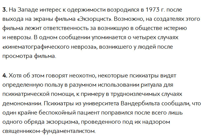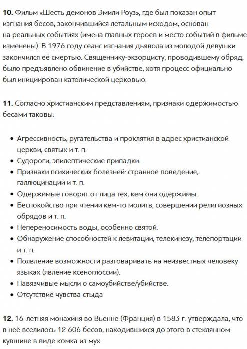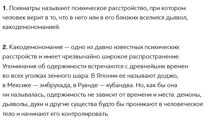 Современная наука в одержимость бесами не верит и называет подобные вещи психическим расстройством. У церкви на этот счет есть свое мнение. А простые люди сами для себя выбирают ту сторону, которая им ближе. Далее вас ждут короткие факты об одержимости, различных мнениях на этот счет, методах лечения данного заболевания в медицине и практике изгнания бесов в церкви. ![]() ![]() ![]() ![]() ![]()