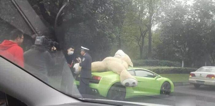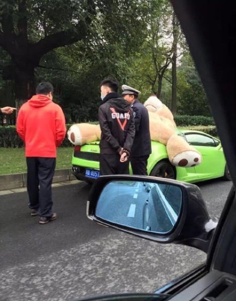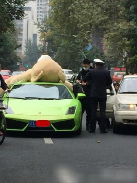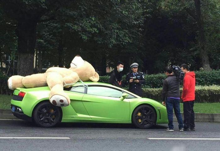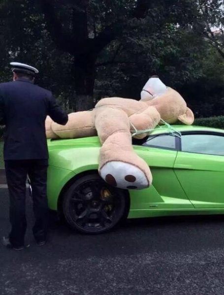 Дорожная полиция города Чэнду остановила суперкар Lamborghini с огромным плюшевым медведем, привязанным к крыше автомобиля. Парень явно хотел порадовать свою девушку, но нарушил правила, ограничив себе видимость. ![]() ![]() ![]() ![]()
