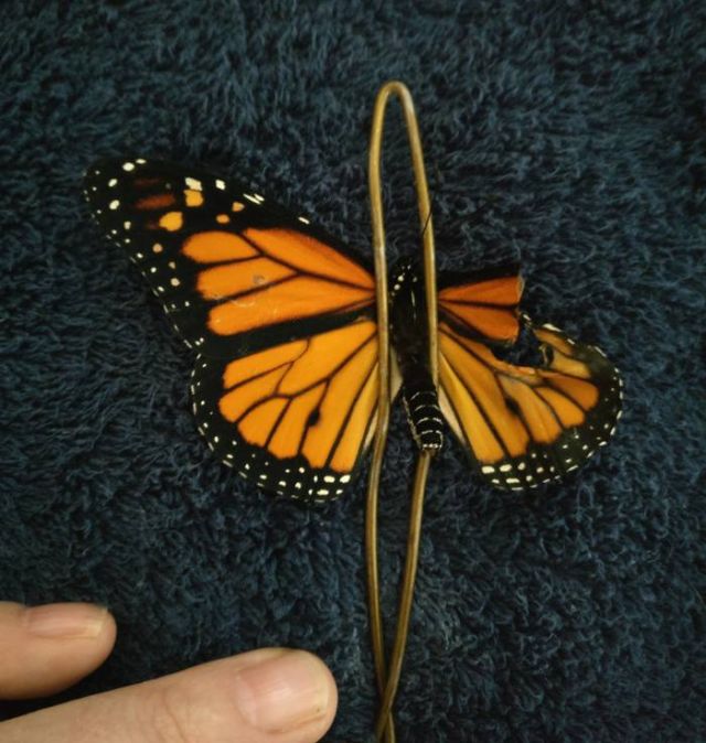 Мало кто может оказать помощь насекомым, но автор этих фотографий попытался это сделать и, судя по всему, у него все получилось. Он решил помочь самцу бабочки Монарха, у которого оказалось поврежденным крыло. Вот инструменты, которые понадобились для операции. Среди них: полотенце, проволочная вешалка, контактный цемент, зубочистка, ватный тампон, ножницы, пинцет, тальк и крыло другой умершей бабочки. Зафиксировав бабочку проволокой, поврежденная часть крыла была отрезана. Затем было приклеено новое крыло. После дня восстановления и поедания домашнего нектара, настало время проверить результат операции. Результат превзошел все ожидания. Бабочка взлетела и села на ветку, после чего и вовсе скрылась.