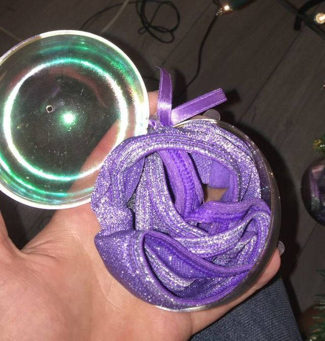 Жительница Ирландии Алекс Бермингем рассказала на своей странице в Twitter историю о том, как ее бабушка перепутала елочные украшения с женским нижним бельем. «Моя 74-летняя бабушка купила эти рождественские шарики в магазине товаров для дома. Когда я начала развешивать их на елку, я поняла, что бабуля, сама того не ведая, купила упакованные в шары блестящие стринги. Всем пошленького Рождества». Пожилую женщину сбило с толку то, что стринги с люрексом находились внутри прозрачных шаров и блестели, а потому она купила шесть таких шаров.