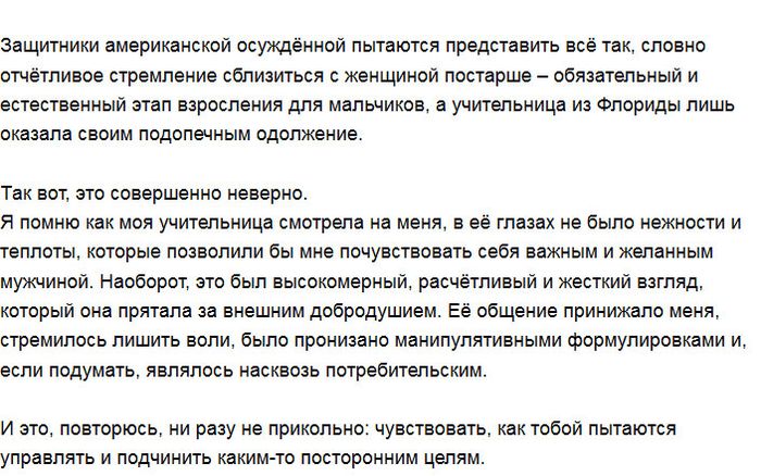 История с американской учительницей Дженнифер Фитчер, имевшей сексуальные связи с тремя 17-летними учениками и получившей 22 года тюрьмы, всколыхнула весь интернет. Немало нашлось людей, которые встали на защиту преподавателя, аргументируя это тем, что в 17 лет многие подростки уже занимаются сексом, и они пошли на это сознательно. Рассуждать на эту тему можно и дальше, но мы предлагаем вам откровения одного блогера, который пережил сексуальные домогательства учительницы в подростковом возрасте и решил рассказать об этом. ![]() ![]() ![]() ![]() ![]() ![]() |