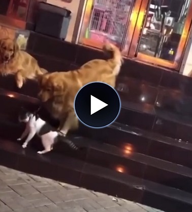 Добродушный ретривер не дал своему усатому товарищу вляпаться в неприятности, который так и норовил заработать себе приключений на хвост. |