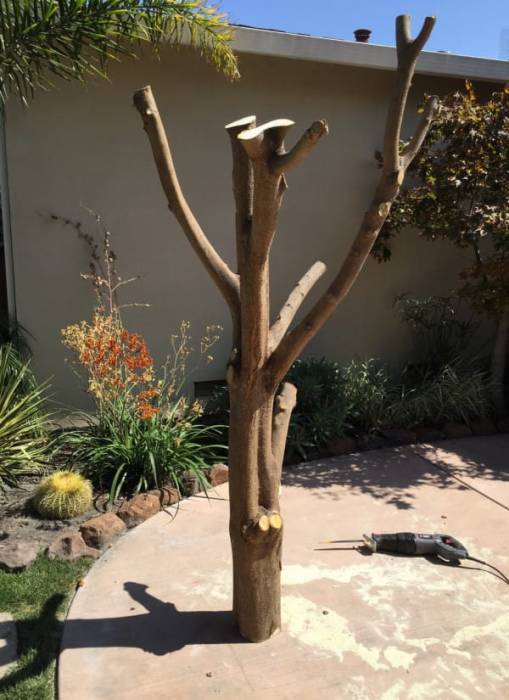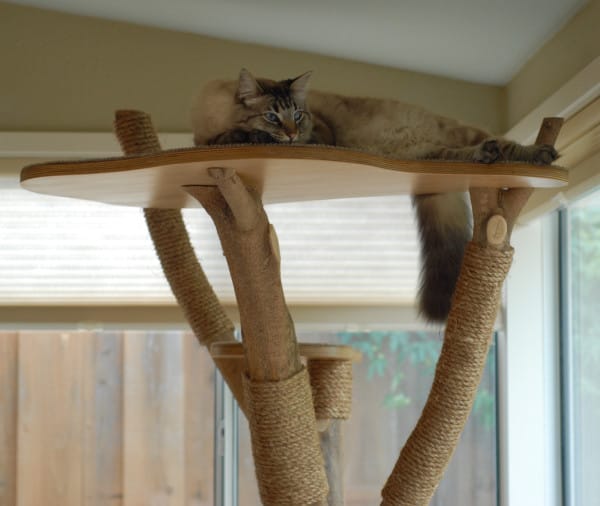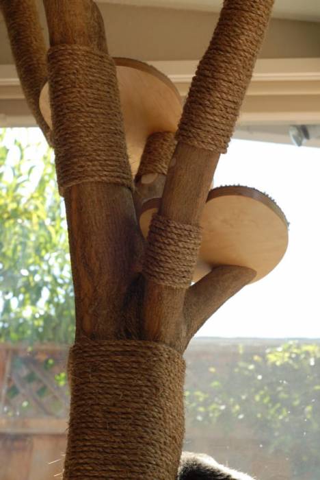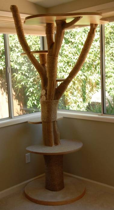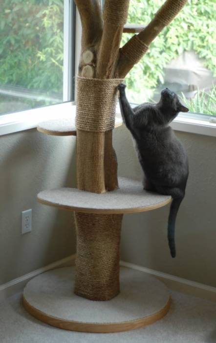 | Кошки постоянно норовят поцарапать новую мебель или обои. Но этого можно избежать, купив для своего пушистого друга специальную точилку для когтей. Или же можно сделать самому игровую площадку для кошки, как и поступила наша героиня. Сначала она срезала небольшое деревце, отпилила мелкие ветви, сорвала листву и занесла в свой двор добычу. Сучки девушка отрезала таким образом, чтобы они напоминали винтовую лестницу. После этого она вырезала два одинаковых круга из фанеры и склеила их между собой, чтобы подставка была более устойчивой. Затем девушка посадила эти круги на саморезы. Далее началась косметическая часть работы. Из картона она вырезала формы будущих полок. А после и сами полки из деревянной плиты. Наконец, полки всех форм и размеров были готовы. К сучкам она их прикрепила с помощью болтов. Но перед этим мастерица подготовила накладки из мягкой ткани, устойчивой к кошачьим когтям. Полки были обработаны морилкой и лаком. После чего закреплены на опоре, а ствол девушка обклеила толстой бечевкой. Вот и всё! Точилка готова… …а коты неимоверно счастливы такой замечательной игровой площадке! Порадуй своих любимцев, если у тебя есть свободное время и пространство для установления такой точилки. Они будут очень рады подарку.