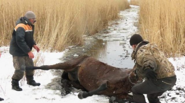 | В Саргатском районе Омской области были задержаны члены банды, занимавшейся кражей домашних животных. Выйти на след преступников удалось благодаря обращению 66-летней пенсионерки, которая сообщила о краже коня. Задержанные рассказали о судьбе всех животных и оказалось, что украденному коню срочно нужна помощь. Оказалось, что животное застряло в болоте в 20 километрах от деревни Новопокровка. Преступники не смогли его вытащить и бросили там умирать. Полицейские поспешили на помощь и нашли коня. Он сильно замерз, так как находился почти по шею в ледяной воде, и уже не надеялся на спасение. На помощь пришли местные жители, и совместными усилиями коня удалось достать из воды. Замерзшего коня вернули хозяйке и теперь он отогревается в теплом хлеву.