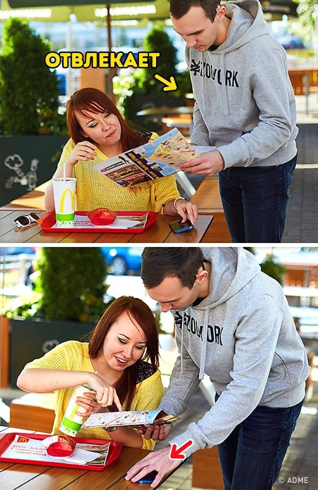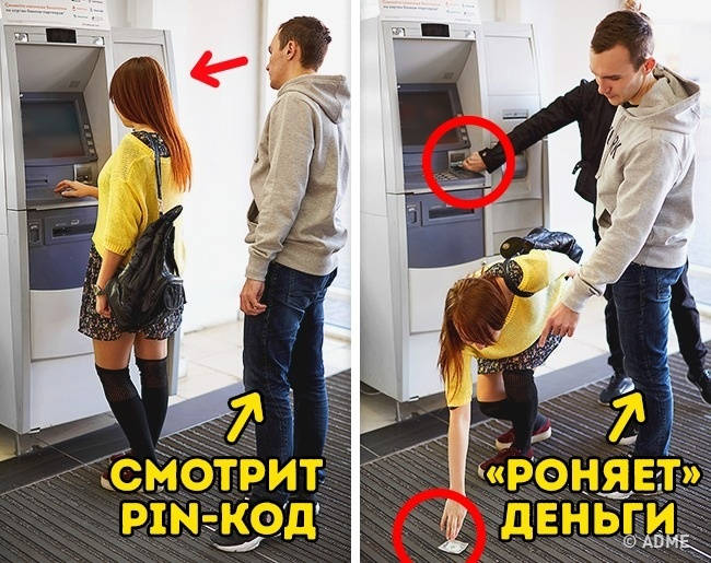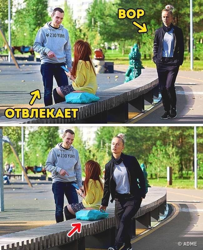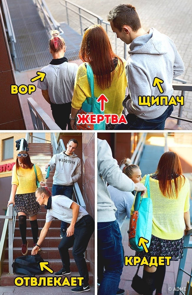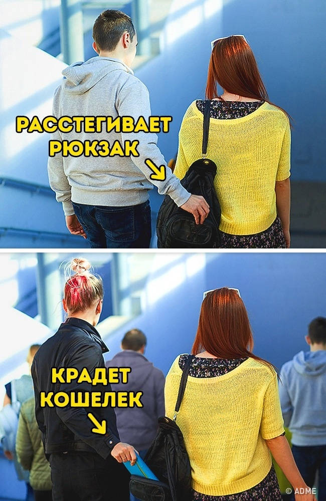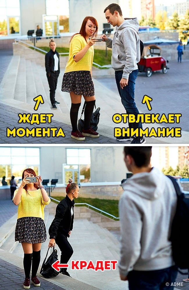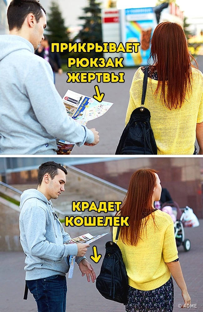 | Преступники готовы любой ценой заполучить ваши вещи. Для этого они придумывают различные уловки и изощренные схемы, которые работают на все 100 % — конечно, если не знать о них. Ведь кто предупрежден, тот вооружен. Поэтому, чтобы ваш кошелек оставался с вами, AdMe.ru рассказывает про 7 воровских схем, из-за которых вы становитесь легкой добычей. № 1. Ой, сумка выскользнула Один из преступников идет впереди вас и как бы случайно роняет сумку (или даже чемодан) прямо у ваших ног. Естественно, вы резко тормозите и спотыкаетесь. А в это время его сообщник резко и решительно вытягивает ценный предмет прямо из вашей сумки. Все происходит за несколько секунд, а опомнитесь и заметите пропажу вы еще не скоро. Как защититься: Кладите телефон и кошелек во внутренние карманы одежды. № 2. О, это же моя любимая книга Сидите вы в парке и спокойненько читаете книжку, как вдруг подходит к вам человек и говорит: «Это же мой любимый автор!» или «Какое у вас замечательное пальто. Где купили?» Он выглядит доброжелательным и веселым, а задача у него только одна: отвлечь вас, пока его подельник уже скрывается с вашим добром. Как защититься: Проденьте руку в лямку вашей сумки или рюкзака и пододвиньте так, чтобы он был как можно ближе к телу. Или поставьте на землю перед ногами. № 3. Извините, вы тут уронили Когда вы снимаете наличные у банкомата, человек за вашей спиной может подглядеть PIN-код. А когда банкомат готов выдать деньги, этот человек кладет на пол купюру и окликает вас. Вы наклоняетесь, а его сообщник забирает вашу карту. Интересно то, что вы даже и не вспомните про нее. Ведь сначала банкомат отдает карточку, а потом выдает деньги. Вы забираете наличку, потому что именно за ней вы сюда пришли. А ваша карта остается у злоумышленников. Как защититься: При наборе ПИН-кода закрывайте цифры рукой так, чтобы было невозможно подглядеть. Отходя от банкомата, проверяйте, на месте ли ваши документы и карточка. № 4. Прямо у всех на виду Чаще всего карманники орудуют в местах большого скопления людей. Почему? Потому что так обчистить вас намного легче — достаточно прикрыть крадущую руку газетой. А в толпе на это никто даже не обратит внимания, ведь все куда-то спешат. Как защититься: Опять же, не кладите ценные предметы и кошельки в рюкзак. № 5. Слаженная работа Верный способ вытащить вещи из рюкзака или сумки, чтобы вы этого не заметили, — это расстегивать замок потихоньку. Сначала проходит один преступник, который расстегивает замок, а затем появляется тот, кто вытащит все ценные вещи. Как защититься: Старайтесь покупать рюкзаки и сумки с закрытой молнией и прятать бегунок. Такой замок сложно расстегнуть незаметно. № 6. Подскажите дорогу Когда вы сидите за столиком, к вам подходит человек, говорит, что он турист, и просит показать маршрут, улицу или какое-либо место. В то время, пока вы пытаетесь ему помочь, он забирает из вашего кармана или даже со стола телефон и кошелек. Как защититься: Не вешайте сумку на край стула и не кладите вещи на стол. № 7. Сфотографируйте меня, пожалуйста Один из преступников просит вас сфотографировать его и дает камеру. Чаще всего это какая-то старая или дешевая камера, чтобы в случае чего можно было бросить ее и убежать. Вы кладете сумку на землю, но вас просят подойти чуть ближе, пока сумка не окажется за вашей спиной. Тут-то ее и забирают. Как защититьс