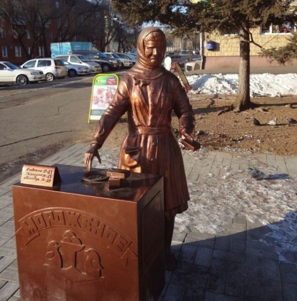 | В центре Благовещенска есть памятник, который установили в честь обычной продавщицы мороженого Зинаиды Синицыной. Памятник установили благодарные жители города, которые знали Зинаиду Дмитриевну под прозвищем Снегурочка. С 50-х годов и до самой смерти в 1988 году эта женщина продавала мороженое, причем встретить ее можно было даже в холодные зимние дни, непогоду и праздники. Женщина всегда сознательно относилась к своей работе, а потому местные жители собрали деньги, чтобы установить ей памятник, помогли в этом и власти. Зинаида Синицына за работой Памятник в ее честь За плечами Зинаиды Синицыной героическое прошлое. В годы Великой Отечественной войны вместе со своим мужем она воевала в партизанском отряде, но была схвачена карателями. Ее пытали, а потом убили ее трехлетнего сына Василия, однако женщина не предала своих боевых товарищей. Source |