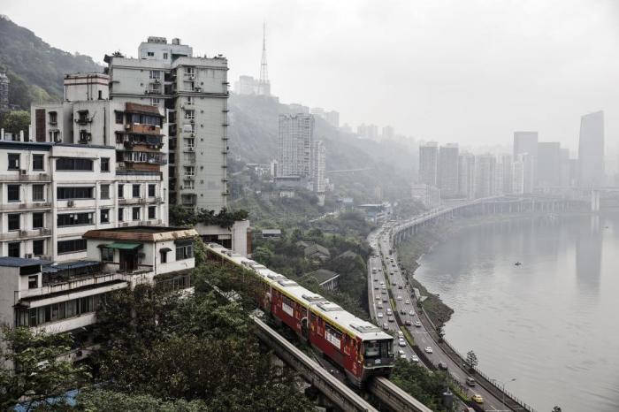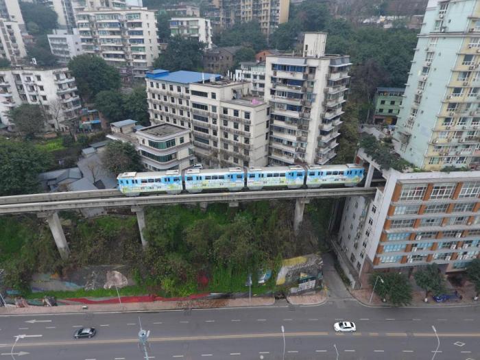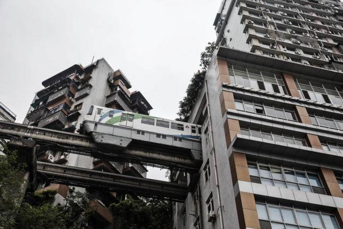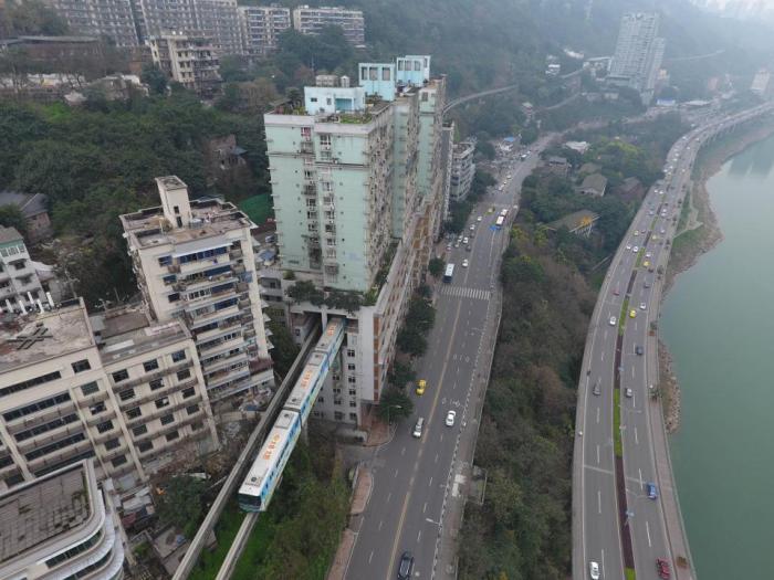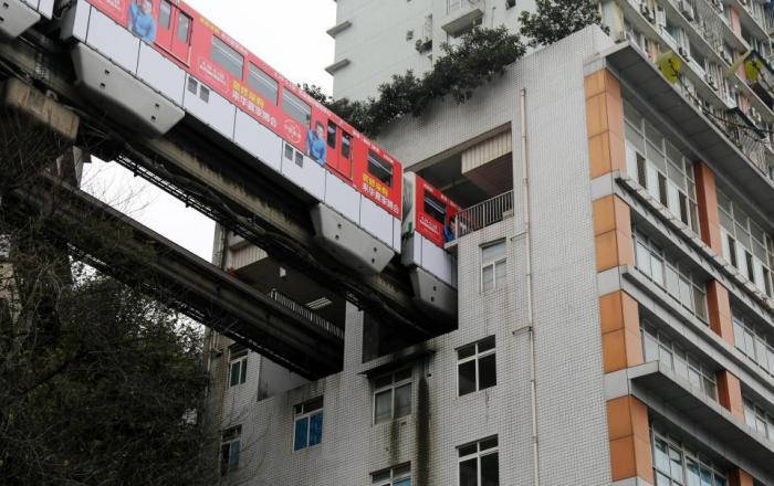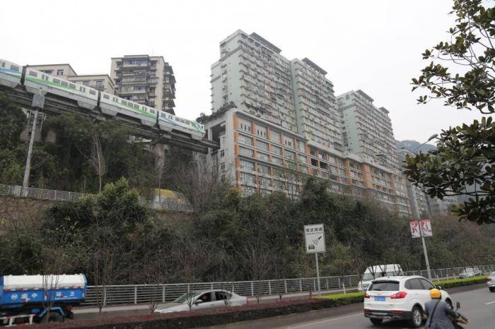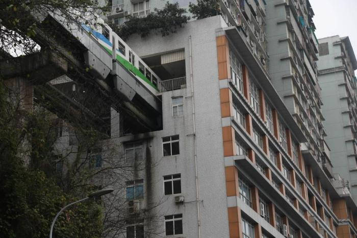 Город Чунцин на юго-востоке Китая с населением 49 млн. человек очень плотно застроен, в результате градостроители проявили находчивость при строительстве монорельсовой железной дороги. Они не стали сносить 19-этажный жилой дом или строить дорогу в обход его, а прошли прямо через дом. Между шестым и восьмым этажами есть станция Liziba, на которой жильцы дома могут сесть в поезд. С помощью специального оборудования снижен шум, его уровень не выше чем у посудомоечной машины.
