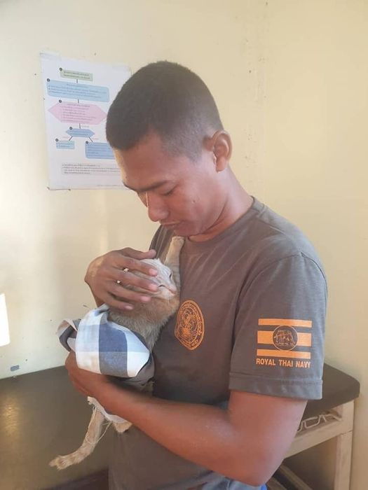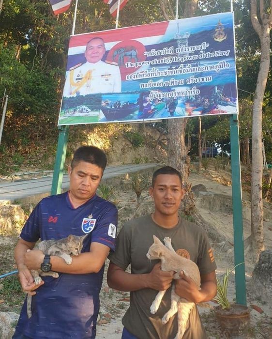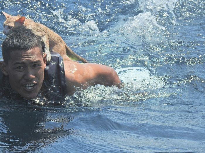 | На днях у северного побережья острова Ка Данга, провинция Сатун, Таиланд, на рыболовном судне Bamon Sin Nava начался пожар, в результате которого судно было сильно повреждено и начало тонуть. На корабле находилось в общей сложности 8 членов экипажа, из них 3 гражданина Таиланда и 5 граждан Мьянмы, и как потом оказалось ещё 4 кошки. Оперативное подразделение береговой охраны Военно-морских сил Таиланда приступило к спасательной операции, и все рыбаки были благополучно подняты на борт прибывшего катера. Рассматривая судно с помощью зума на камере, один из военных заметил высунутые головы четырёх кошек, обречённо сидящих на деревянной балке тонущего корабля. Морской офицер Таттафон Сай без промедления поспешил им на помощь. Предварительно надев спасательный жилет, он переправил кошек по одной у себя на спине до катера, к которому его тянули за верёвку его сослуживцы, благодаря чему кошачья спасательная операция была проведена быстро и своевременно: никто из пушистиков не пострадал. Все кошки были спасены и увезены в подразделение береговой охраны, где их успокоили, высушили и накормили. И теперь с пушистыми созданиями, попавшими в руки моряков-спасателей, уже точно всё будет хорошо. Фотографии, опубликованные на странице Военно-морских сил Таиланда в Facebook, получили тысячи лайков и перепостов, а пользователи в комментариях поблагодарили лично моряка и всех тех, кто причастен к спасению кошек.