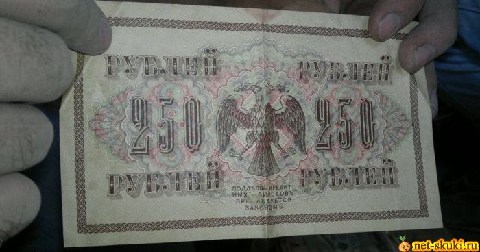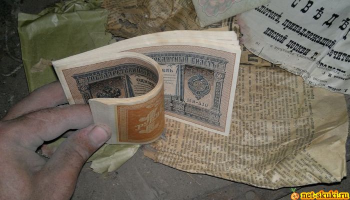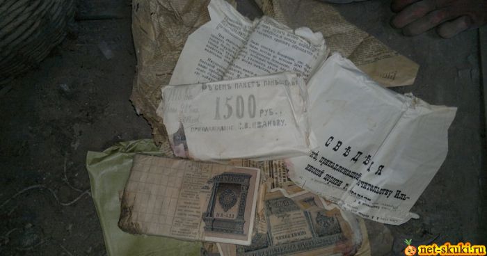 | Не так давно один мужчина обнаружил заначку 100-летней давности, которая все это время пролежала на одном старом и давно уже заброшенном чердаке. С содержимым заначки он решил поделиться с пользователями сети. На чердаке был обнаружен пакет, подписанный неким Ивановым С. В. - хозяином заначки. Внутри посреди газет и прочих бумаг лежали деньги. Также там были обнаружены и некие документы, подписанные Ивановым, доверенность его супруге на получение денег в сберкассе и прочее. Помимо старых купюр были найдены и совсем новые, в пачках. Купюры самого разного номинала, вплоть до 250 рублей.